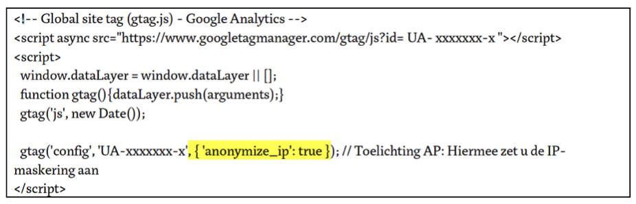 Google biedt de mogelijkheid om een deel van het IP(v4)-adres van je websitebezoekers te verwijderen. Google noemt dit 'anonimiseren', maar de AP vindt dat het resterende deel van het IP-adres nog steeds een persoonsgegeven is. De AP vindt dit anonimiseren overigens wel een belangrijke maatregel om de risico's voor je websitebezoekers te verkleinen. Je doet dit als volgt: