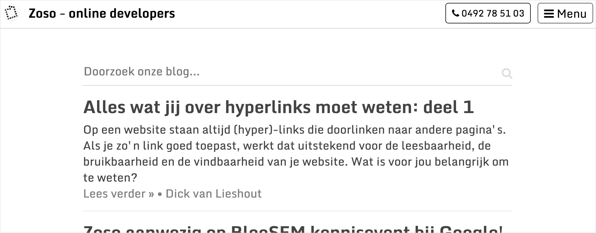 Zoso-websites. Zoso ontwikkelt meestal een eigen zoekfunctie, toegespitst op de website van de klant. Bij een webshop ligt de aandacht bijvoorbeeld meer op de producten (en kun je bijvoorbeeld ook op productcodes zoeken). Bij een informatieve website ligt de focus op de pagina's en bij een blog op de artikelen. Onze zoekfunctie is dus altijd maatwerk, en samen met de klant bepalen we op welke onderdelen relevant zijn voor de zoekfunctie.