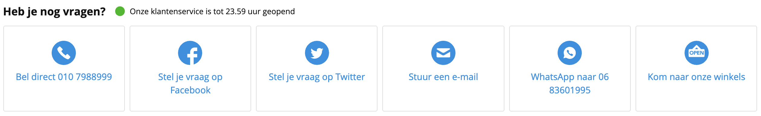Coolblue werkt niet met live chat en stelt wel zes andere klantcontactkanalen ter beschikking.